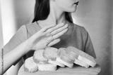 Gluten intolerance concept. Young girl refuses to eat white bread - shallow depth of field
