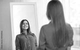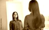 wardrobe, fashion, style and people concept - happy woman in orange shirt looking at mirror reflection at home or clothing store dressing room