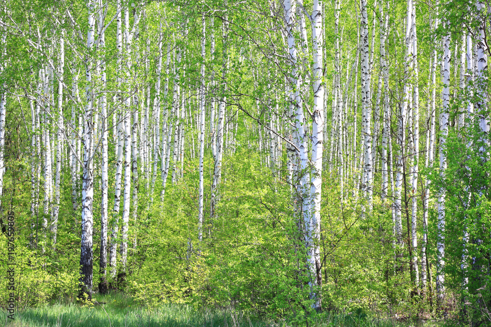 Beautiful young birch trees with green leaves in summer in sunny weather