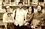 Group of smiling students, two young men and women standing before library bookshelves, holding books and laptop, concept of teamwork