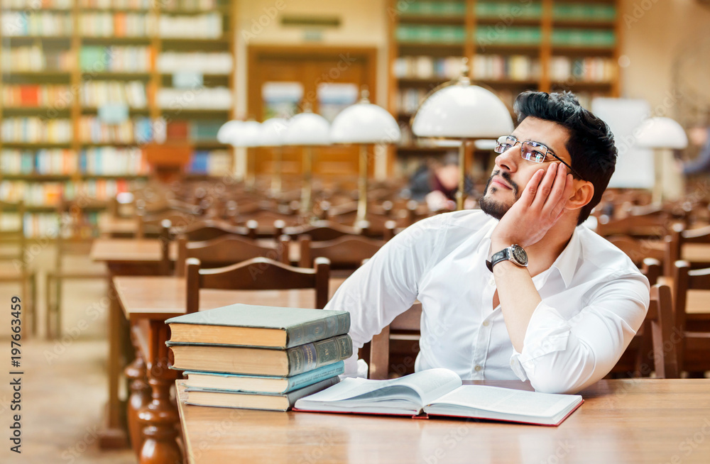 Portrait of young thinking bearded man student with stack of books on the table before bookshelves in the library