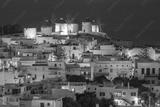 Aerial view with traditional windmills on the island Mykonos, The island of the winds, during evening blue hour, Greece