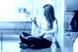 relaxed smiling barefoot woman sitting on the floor looking at her laptop
