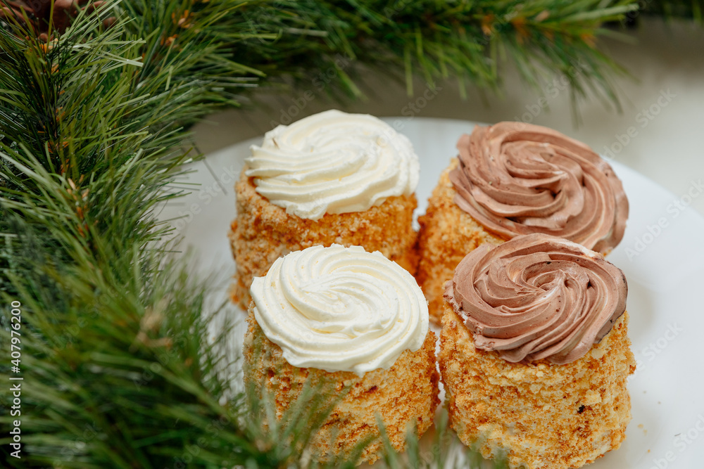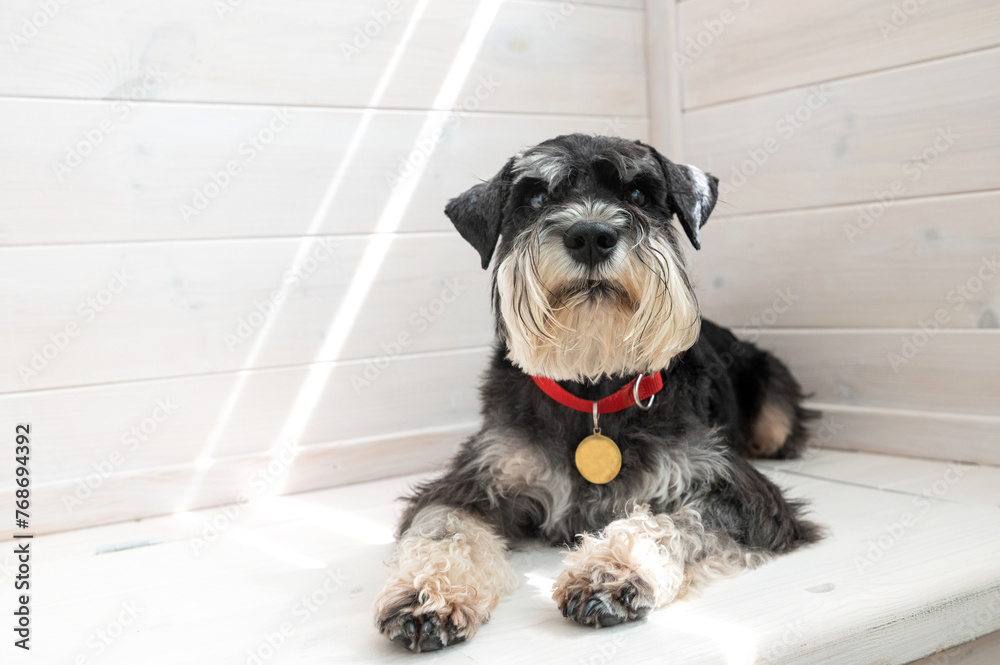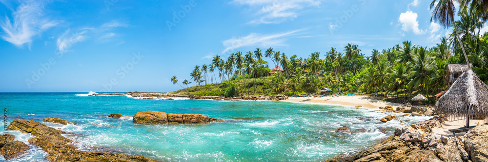 Panoramic view of a small lagoon with traditional wooden fishing boats and old bungalow on the beach in Sri Lanka.