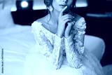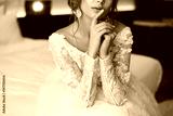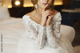 Beautiful, sexy and fashionable brown-haired young woman, in a lace dress, posing in interior - bride's morning