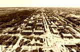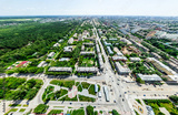 Aerial city view with crossroads and roads, houses, buildings, parks and parking lots, bridges. Helicopter drone shot. Wide Panoramic image.