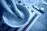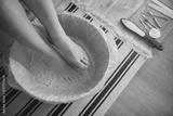 Top view close up woman feet relaxing in bath with foam. Different equipment for pedicure locating near it. Leisure in spa salon concept
