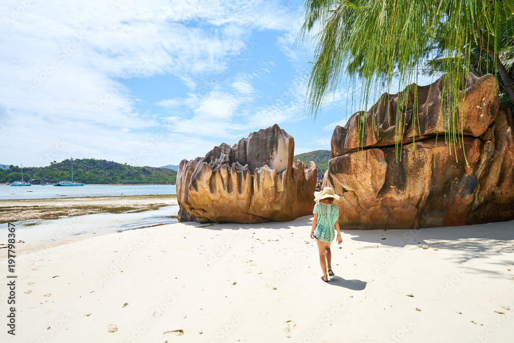 female tourist is walking on Laraie Bay's beach with granite rock, curieuse island, seychelles