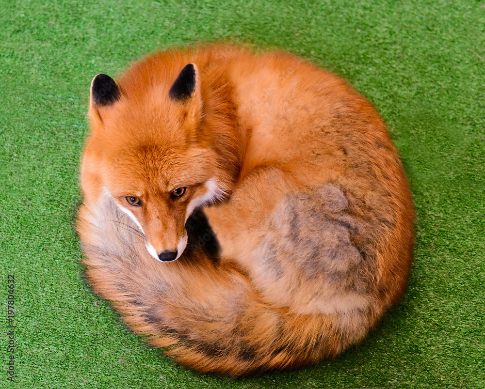 Red fox curled up in green backgrownd