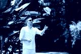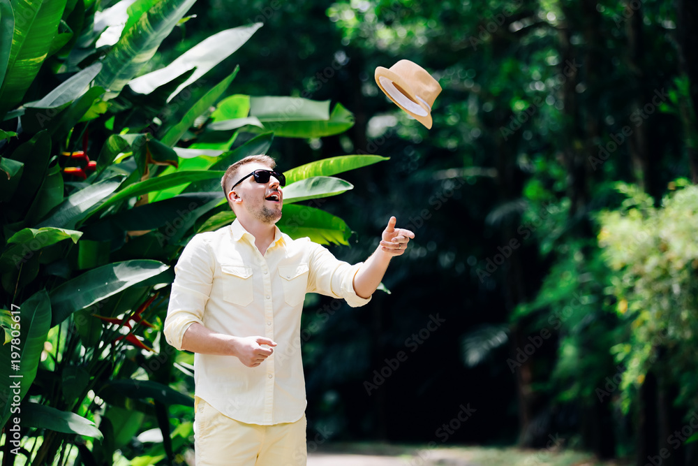Young man in sunglasses casual clothes throuing ylellow hat, having fun in sunny day. Tropical background.