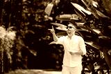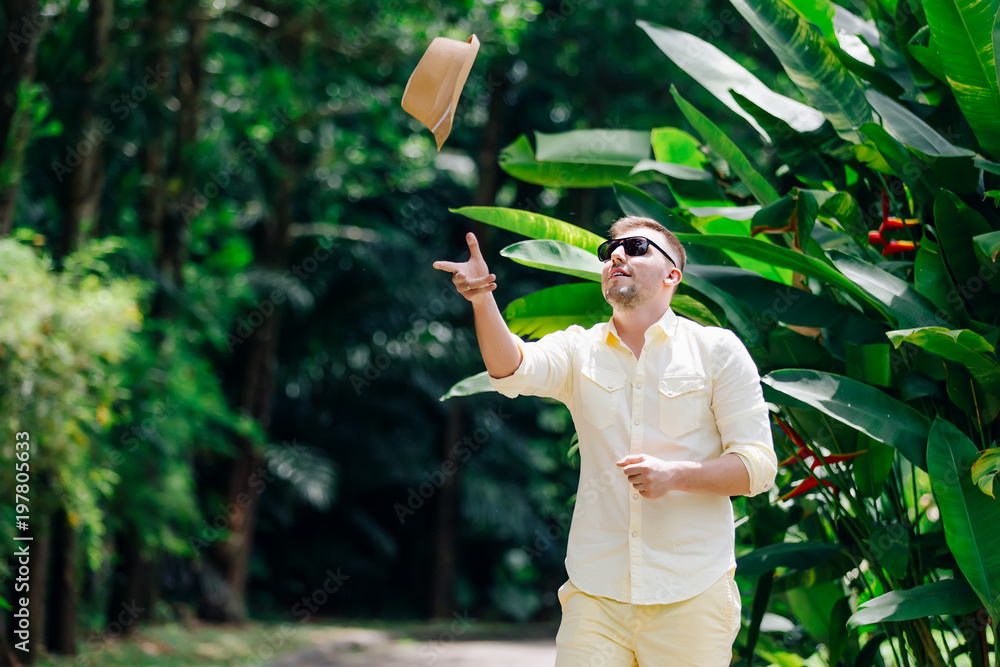 Young man in sunglasses casual clothes throuing ylellow hat, having fun in sunny day. Tropical background.