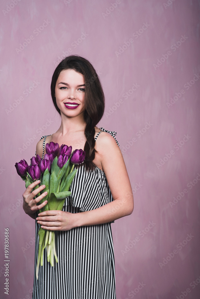 Beautiful smiling girl with a bouquet of purple tulips in hands.