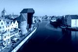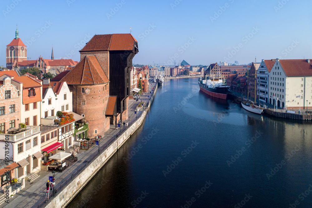 Gdansk old city in Poland with the oldest medieval port crane (Zuraw) in Europe, St John church, Motlawa River, old granaries, ship and yacht. Aerial view in early morning. Sunrise light.