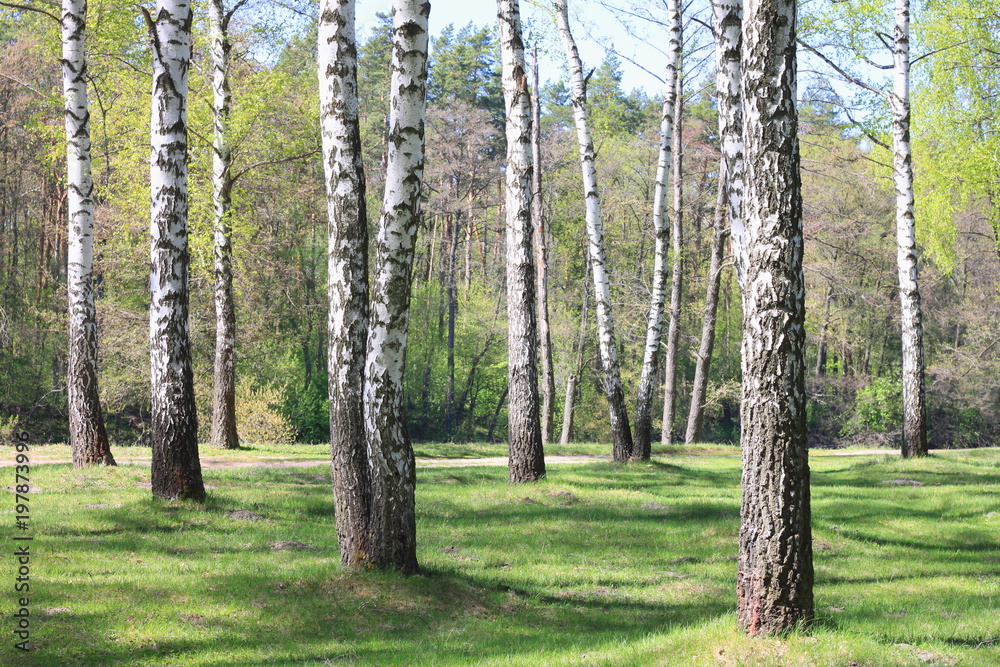 Beautiful young birch trees with green leaves in summer in sunny weather