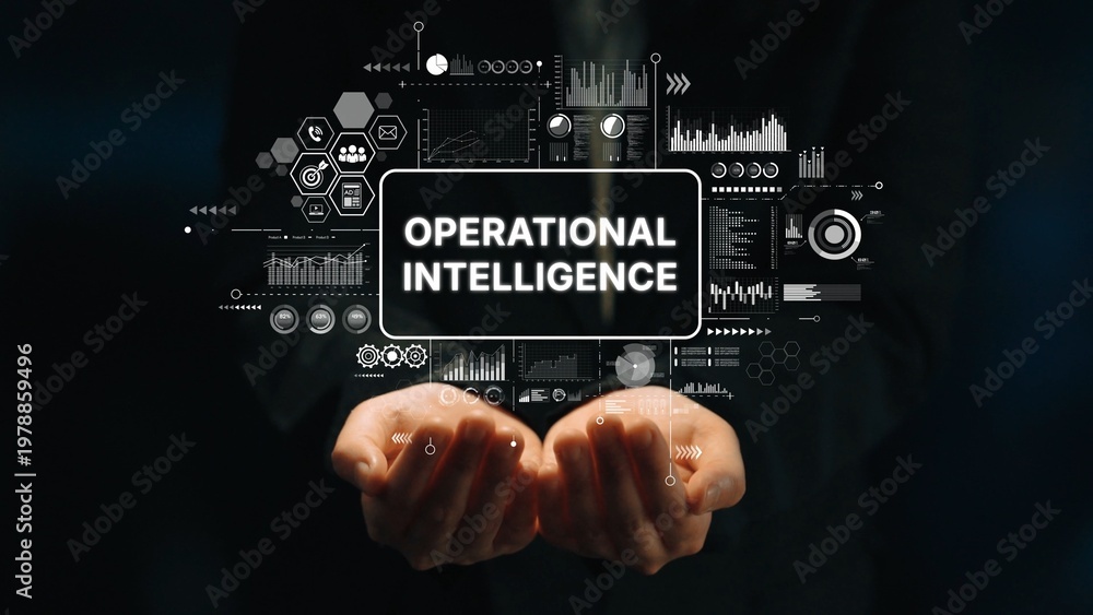 Hands Holding Concept of Operational Intelligence with Data Visualizations and Graphs for Business Insights and Analysis. Asymptotic smart data analytic.
