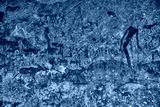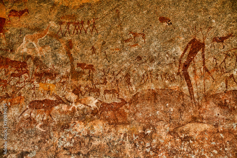 Bushmen rock painting of human figures and antelopes, giraffe of the Matopos National Park, Zimbabwe