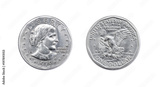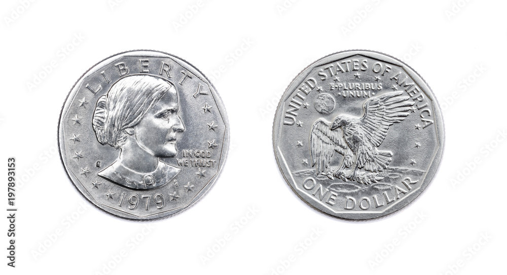 american one dollar coin both sides isolate on white background. 1979 used USA 1 dollar realistic photo image