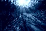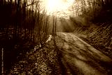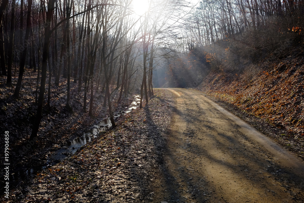 Forest pathway with sunbeam in the early spring