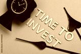 Text TIME TO INVEST and cutout paper human head with clock on beige background. Closeup