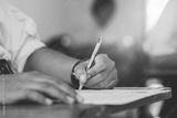 Students writing and reading exam answer sheets exercises in classroom of school with stress.
