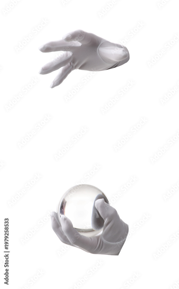 Male magician's hands with crystal ball on white background