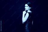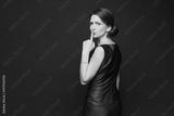 Beautiful and fashionable young brunette woman in blue dress isolated at dark background