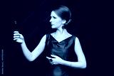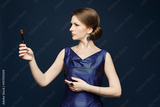 Beautiful and trendy young brunette woman in blue dress holds a make-up brush in her hand