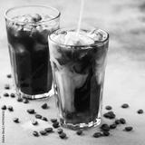 Ice coffee in a tall glass with cream poured over and coffee beans. Cold summer drink on a blue rusty background