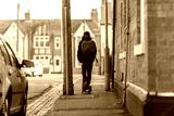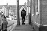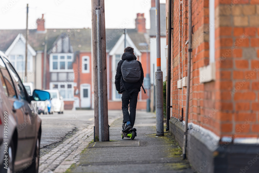 Boy on electrical scooter driving to British school in UK