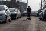 Boy on electrical scooter driving to British school in UK