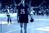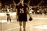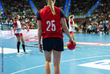 Back view of a female handball player in a red jersey with number 25 holding a ball, standing on the sideline with blurry players and crowd.