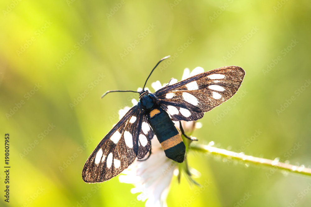 Butterfly with black wings on green plant. Nine-spotted moth or yellow belted burnet Amata Syntomis phegea, family Erebidae tiger moths.
