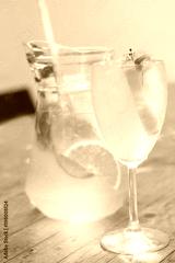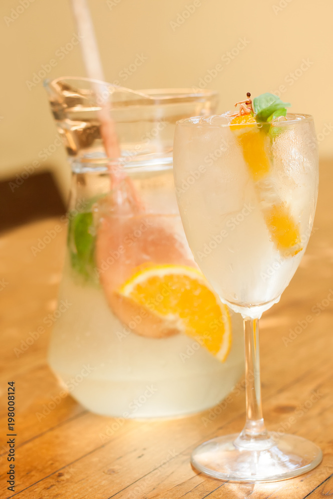 Beautiful woman bikini sunning on citrus lemonade glass. Refreshing drinks summertime concept with miniature girl figure