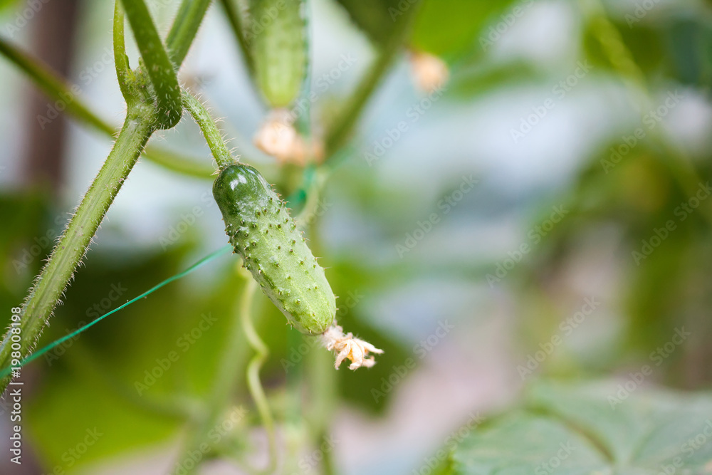 Organic green cucumber branch closeup. Beautiful blurred background greenhouse. Selective focus.