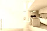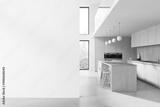 Minimalist modern kitchen interior with light wood cabinetry, long island, stools, pendant lights, tall windows and bright spacious architecture concept mockup. 3D Rendering