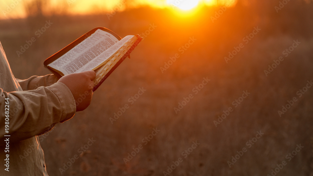 Person reading a Bible outdoors during a warm sunset with golden light illuminating the scene