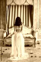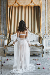 Half naked, sexy and beautiful, brunette model woman wearing in lingerie, stands back at the bedroom