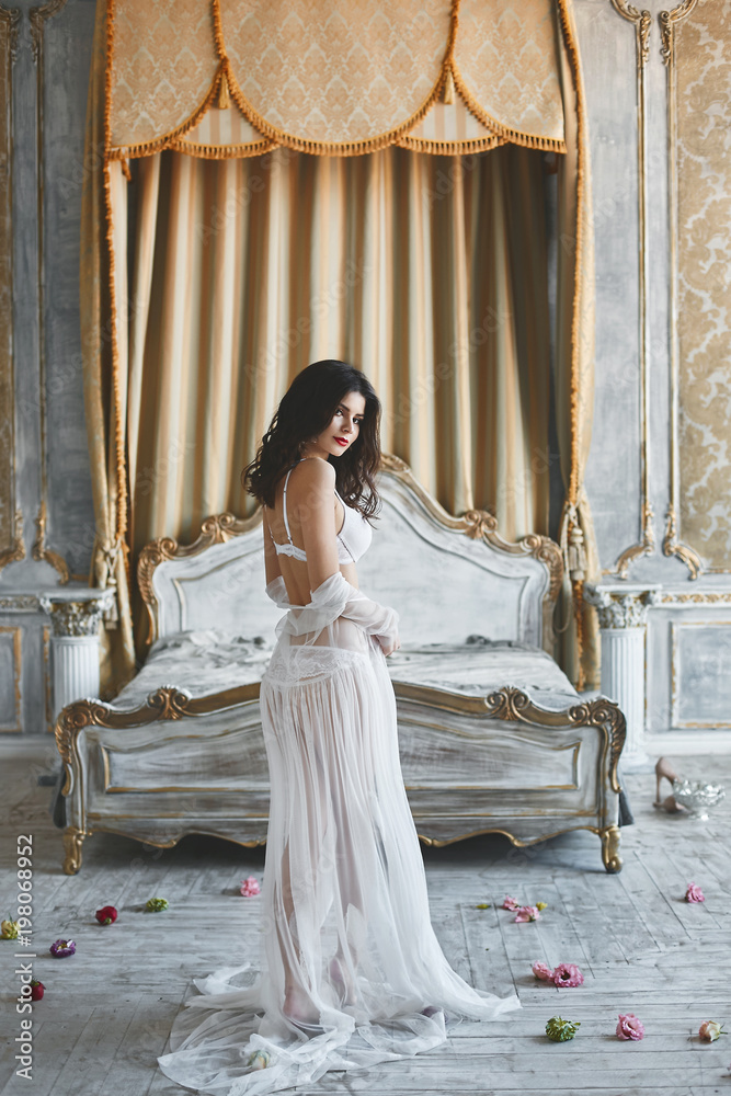 Half naked, sexy and beautiful, brunette model woman wearing in lingerie, stands back at the bedroom