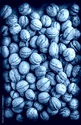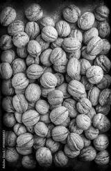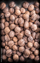 Walnuts overhead closeup large arrangement in peel on dark background in studio