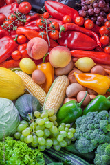 Vegetables and fruits fresh overhead mix large group rainbow background