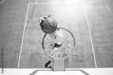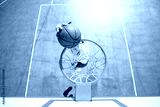 Young man jumping and making a fantastic slam dunk playing streetball, basketball. Urban authentic.