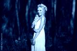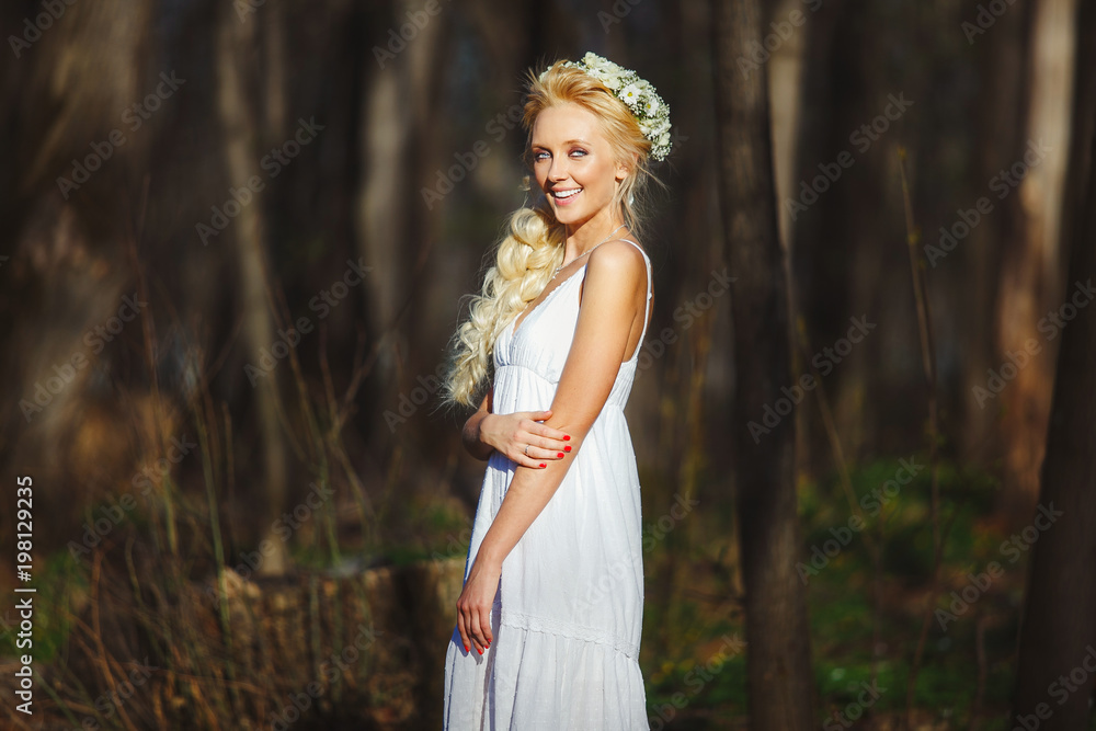 beautiful woman in white dress in the middle of spring forest.