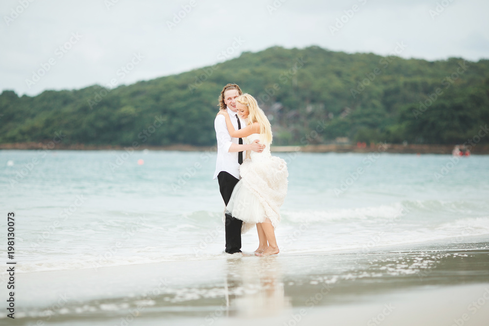bride and groom hugging at the sea. couple in love on deserted beach.