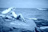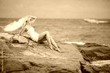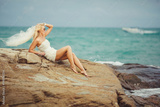 bride in short wedding dress on the rocky beach. young beautiful woman in wedding day.
