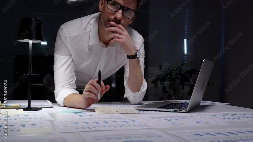 Dedicated businessman intensely analyzing financial documents and charts spread across his desk under a table lamp, concentrating on complex data in a dark office while working late evenings
