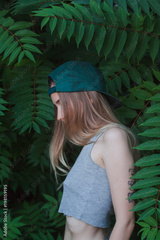 Portrait of beautiful young woman in green leaves, blonde pretty lady in spring bushes