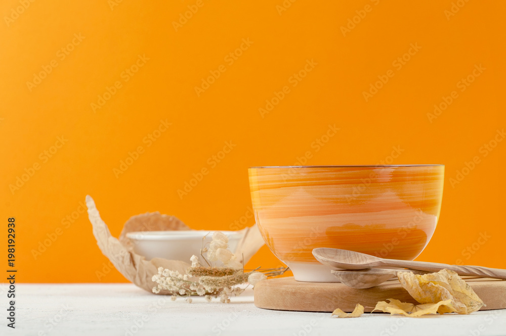Orange salad bowl on a stand and wooden spoons on a bright orange background. Autumn decoration..