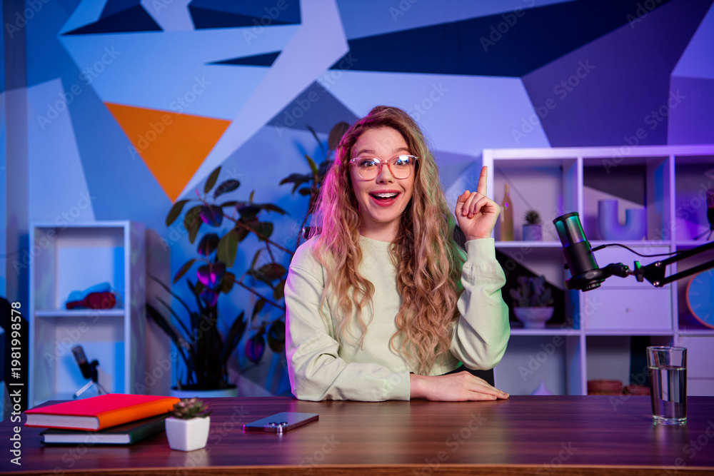 Young blogger recording content in a colorful home studio with modern equipment and microphone for online streaming