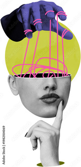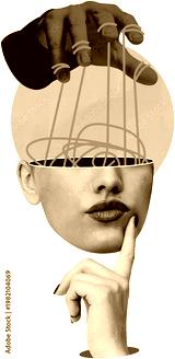 A conceptual collage showing a person’s face with an open head and strings pulled by a hand, in a stylized graphic look, on white background, symbolizing control and influence