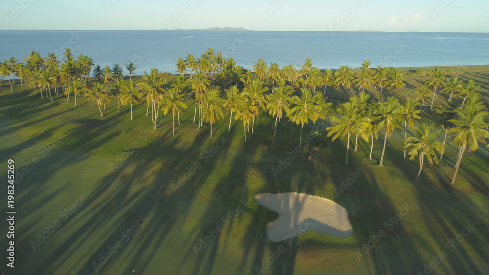 AERIAL: Flying over tranquil golf course illuminated by gentle evening sun rays.